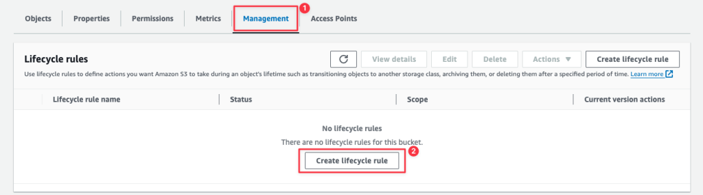 Once you have your S3 bucket let’s go over to the “Management” tab and click on “Create lifecycle rule”. This isn’t strictly necessary but I wanted to move older backups to cheaper S3 storage after a certain amount of time.