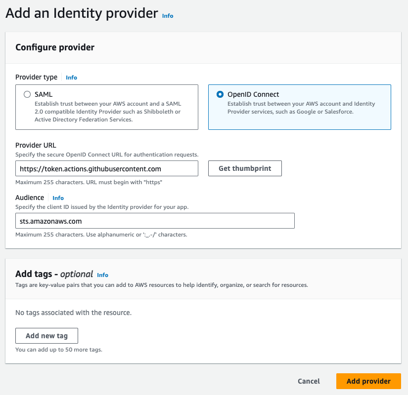Once that’s done head over to IAM to add an Identity Provider. This is so that GitHub can assume the role without having to add in any access key/secret to your GitHub Actions Secrets. Go to “Identity Providers” then click “Add provider” and fill in the following: